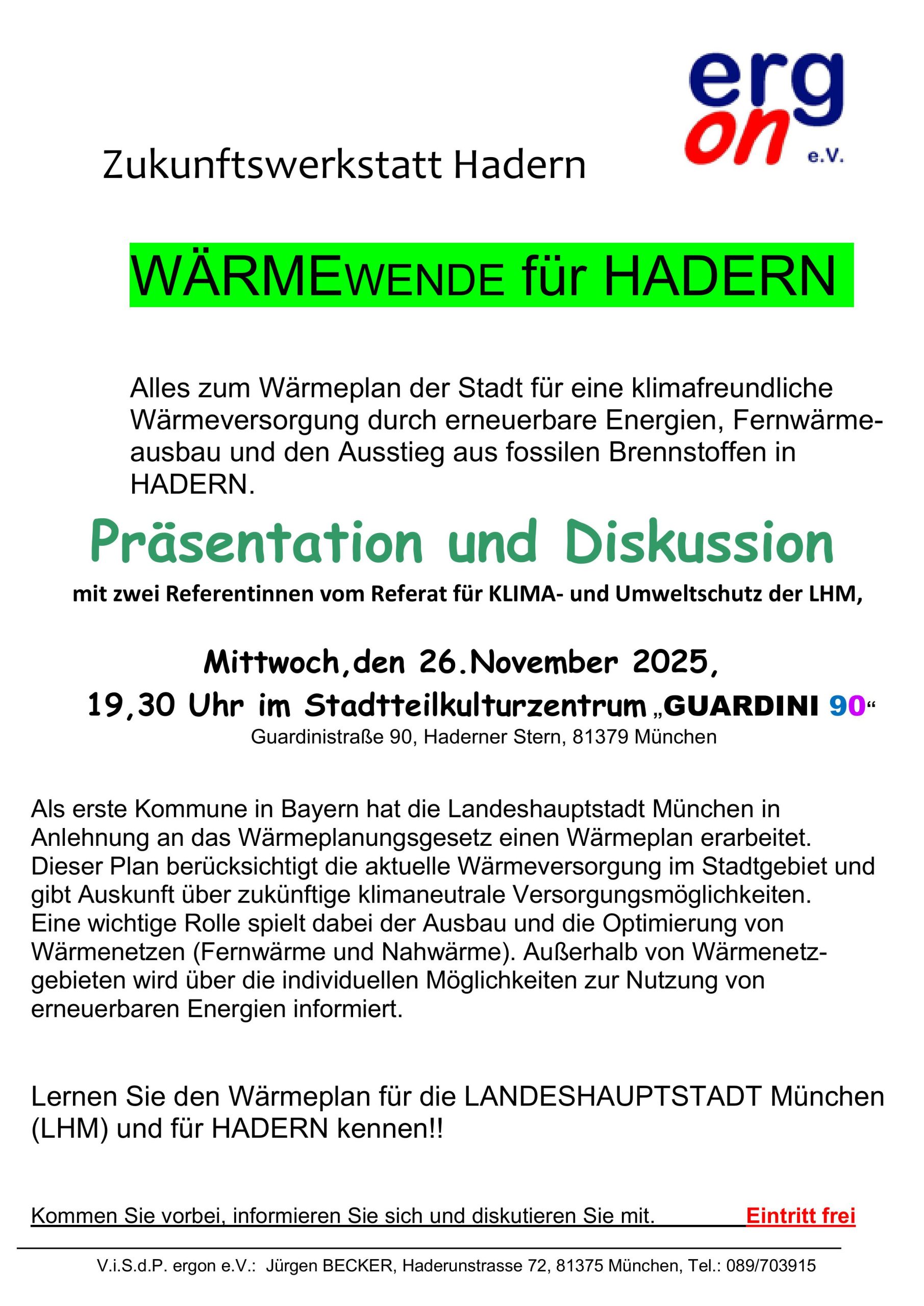 26. November 2025(1 Veranstaltung) 19:30: Wärmewende für Hadern - Präsentation und Diskussion Stadtteilkulturzentrum Guardini90 |
